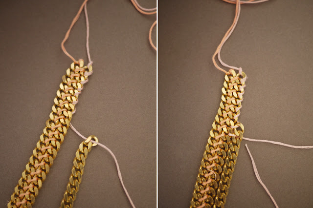 Usando um fluxo de cor diferente, tecer o fio ao redor dos primeiros links - mais uma vez deixando cerca de um pé de folga extra. Weave da cadeia no colar usando a mesma técnica.